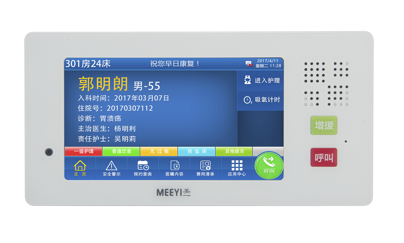 5. 分机界面显示患者信息、护理标识、药物过敏、饮食类别、费用信息、医嘱信息、温馨提示等信息,可顺利获得护士站软件下发和修改;